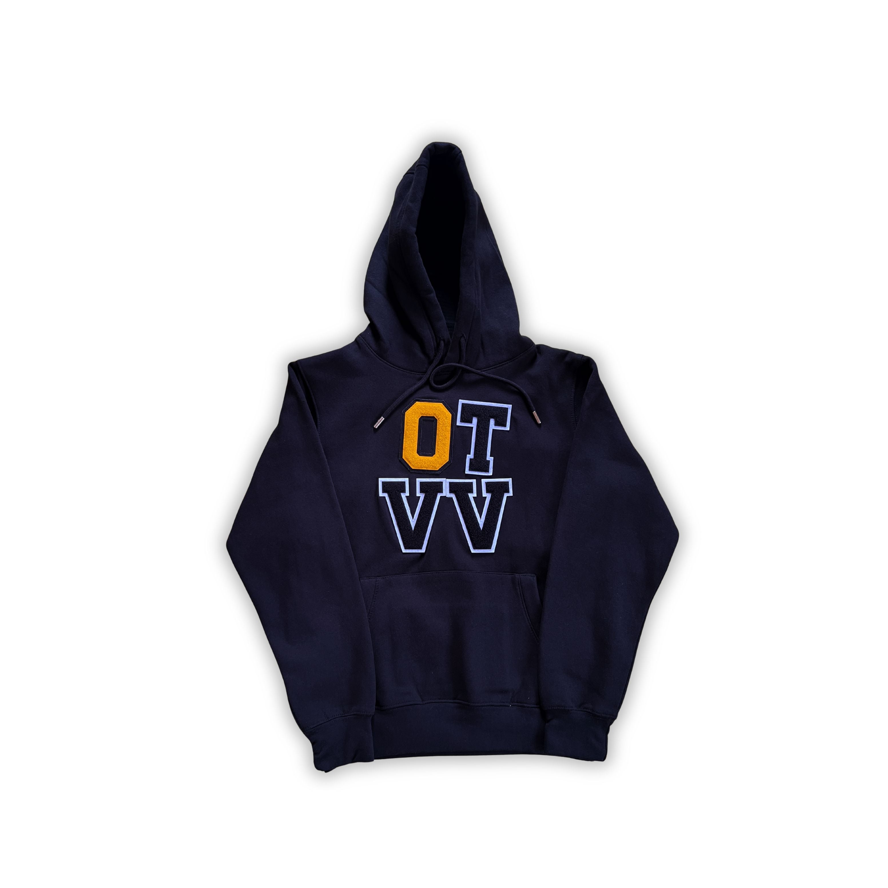 A heavyweight classic hoodie. 100% cotton at 12 oz (406 GSM), The black base sets the stage for bold embellishments of chenille patches in yellow, black, and white, giving it that timeless varsity energy with an OTW twist. VV=W for OTW.